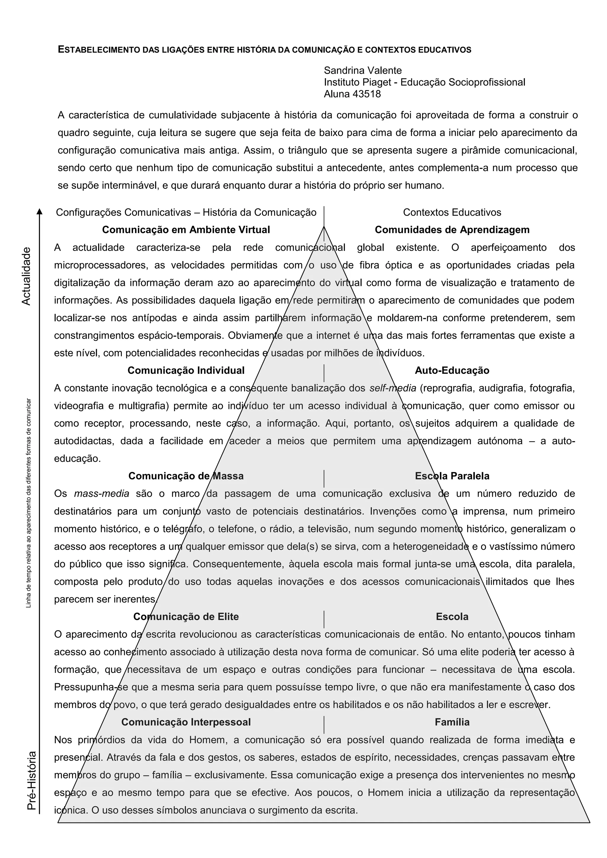 1) O documento estabelece ligações entre a história da comunicação e contextos educativos, traçando uma linha do tempo desde a comunicação interpessoal na pré-história até a comunicação em ambiente virtual na atualidade.