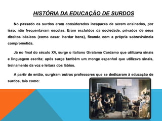 O documento descreve a história da educação de surdos no Brasil desde o século 15 até os dias atuais. Ele discute como os surdos eram tratados no passado, o desenvolvimento de métodos de ensino e a fundação da primeira escola para surdos no Brasil no século 19. Também aborda o reconhecimento legal da Língua Brasileira de Sinais e o desenvolvimento contínuo dos direitos educacionais dos surdos.