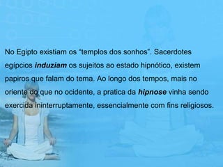 A hipnose tem origens antigas e foi usada por diversas civilizações ao longo da história. Sua prática evoluiu ao longo dos séculos com contribuições de figuras como Hipócrates, Mesmer e Braid. Atualmente, é usada na hipnoterapia, que emprega técnicas hipnóticas para tratamento físico e mental de pacientes.