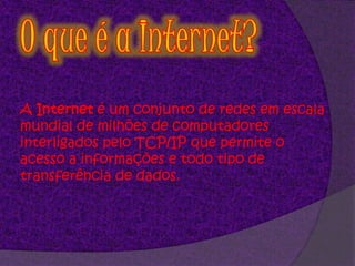 A Internet surgiu da ARPANET, uma rede militar dos EUA criada em 1969 para interligar computadores de centros de pesquisa. Em 1983, a adoção dos protocolos TCP/IP transformou a ARPANET na Internet. Em 1990, Tim Berners-Lee criou a World Wide Web, permitindo sites dinâmicos e acesso público à Internet. Portugal estabeleceu sua primeira ligação à Internet em 1991.