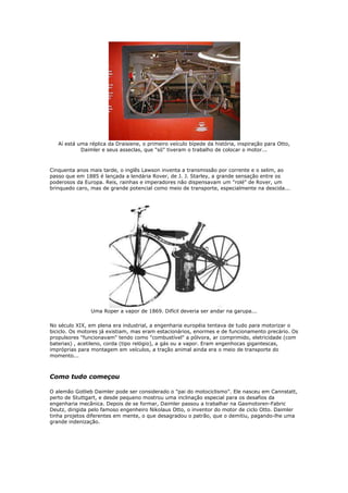 O documento descreve a história da motocicleta desde suas origens no século XVIII na França, quando o Conde de Sivrac construiu o primeiro veículo de duas rodas movido a força humana, até os desenvolvimentos do motor de combustão interna no final do século XIX que permitiram a criação da primeira motocicleta moderna por Gottlieb Daimler na Alemanha em 1885. O documento também discute pioneiros e invenções importantes que contribuíram para o desenvolvimento inicial da motocicleta.