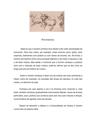 A música é considerada a arte mais antiga, desenvolvendo-se a partir dos ritmos e vibrações da natureza. Ao longo da história, a música esteve presente em rituais e cerimônias, inicialmente apenas com voz e sons corporais, adicionando gradualmente instrumentos construídos. A música assumiu papel central nas civilizações antigas e foi influenciada pelas igrejas cristãs na Idade Média.