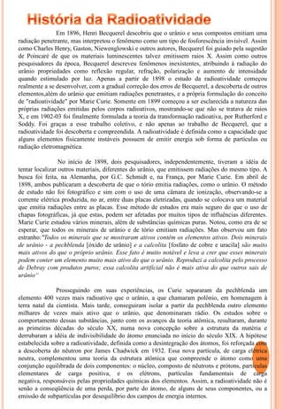 A história da radioatividade começou em 1896 quando Henri Becquerel descobriu que o urânio emitia uma radiação penetrante. Entre 1898-1903, Marie Curie, G.C. Schmidt e outros isolaram outros elementos radioativos como o tório e identificaram três tipos de radiação: alfa, beta e gama. Irène Curie e Frédéric Joliot descobriram a radioatividade artificial em 1934 através do bombardeamento de núcleos com partículas.