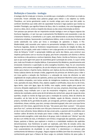 O documento fornece uma história da teologia ao longo dos séculos, começando com Paulo de Tarso no século I. Detalha brevemente os principais teólogos e desenvolvimentos teológicos de cada século, incluindo Policarpo de Esmirna, Clemente de Alexandria, Atanásio de Alexandria, Agostinho, João Escoto Erígena, Tomás de Aquino e outros. Também discute os desafios do pensamento pós-moderno para a teologia e a importância do estudo das línguas originais da Bíbl