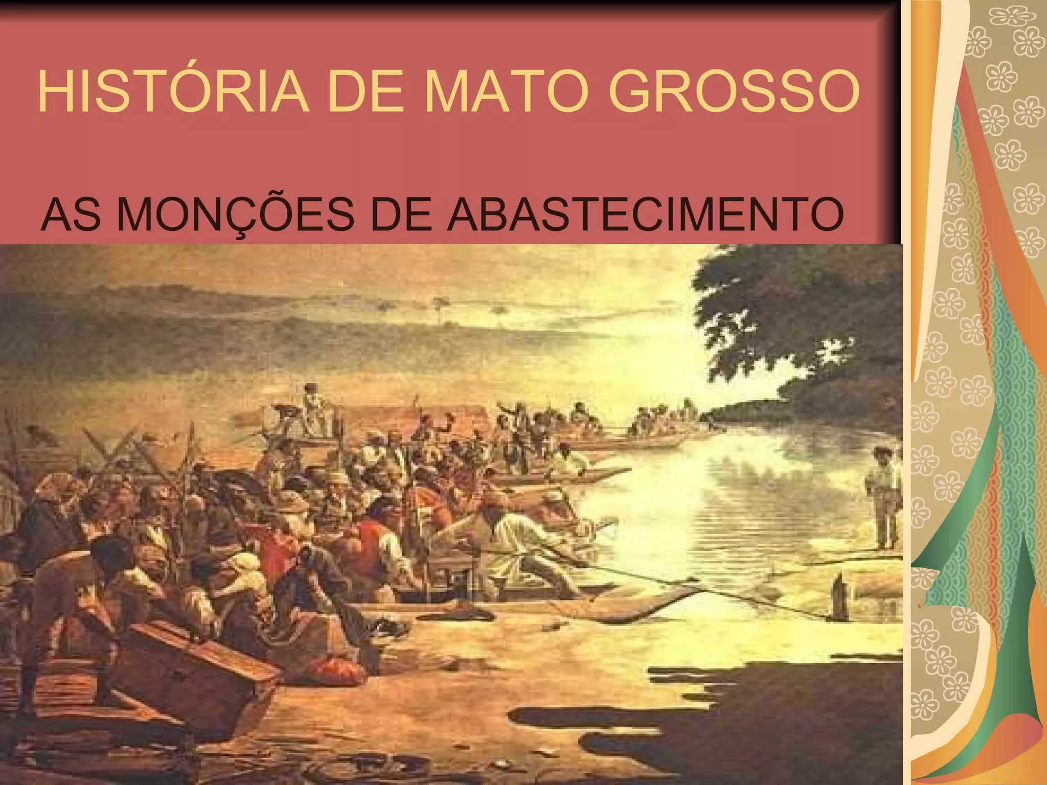 1) As monções eram sistemas de abastecimento que transportavam mercadorias e pessoas entre a Capitania de São Paulo e as regiões mineradoras de Mato Grosso por rio. 2) As monções enfrentavam muitas dificuldades como trechos perigosos nos rios, travessias difíceis e ataques de índios, mas eram o meio mais seguro de chegar à vila de Cuiabá no século 18. 3) A abertura do Caminho de Goiás ofereceu uma alternativa terrestre para