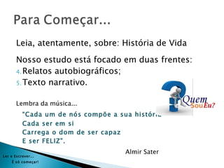 Este documento discute a importância da história de vida e da memória coletiva para a compreensão da identidade e da diversidade. Ele fornece instruções sobre como produzir narrativas baseadas em entrevistas com membros da comunidade que descrevam suas histórias de vida.