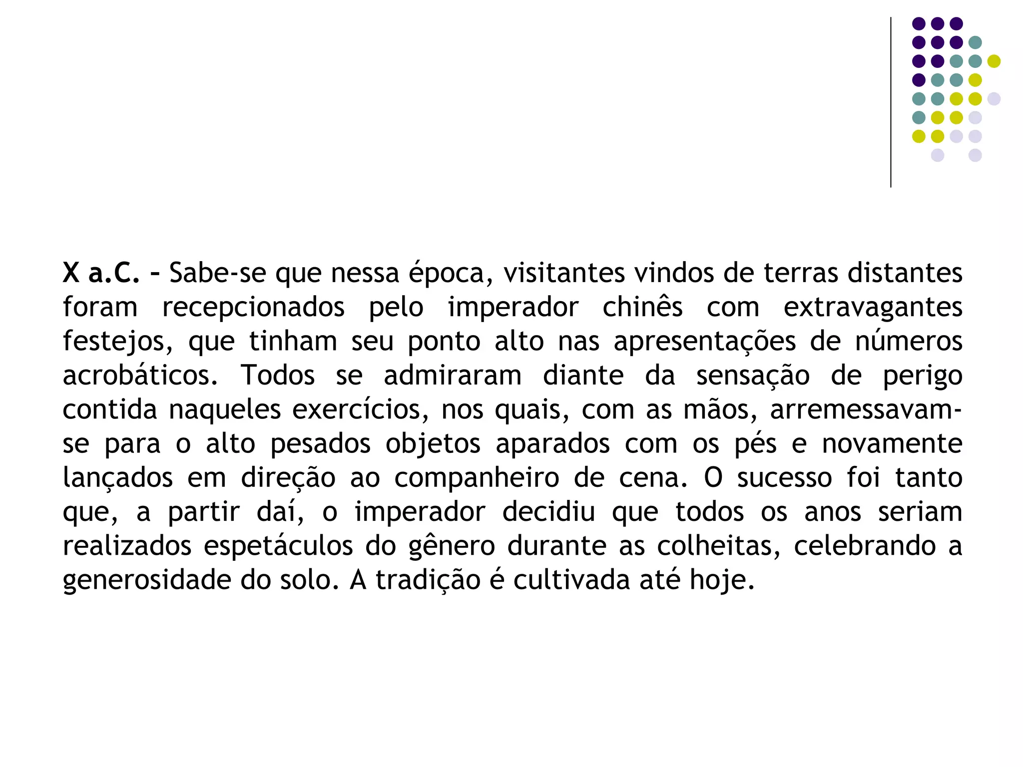 O documento traça a história do circo desde suas origens na China antiga, passando pelo desenvolvimento do circo moderno na Inglaterra do século 18 com Philip Astley, até chegar ao surgimento de grandes circos itinerantes no século 19 e do Cirque du Soleil no Canadá em 1984. O texto também aborda a chegada dos primeiros circos ao Brasil no século 19.