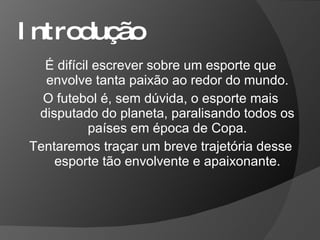 O documento traça a história do futebol desde suas origens na China Antiga e no Japão Antigo, passando pelos jogos gregos e medievais na Europa, até o desenvolvimento das regras modernas na Inglaterra no século XIX e a popularização do esporte em todo o mundo a partir daí, com a criação da FIFA em 1904.