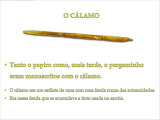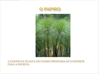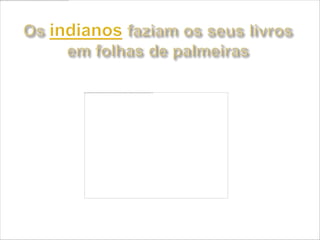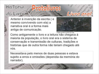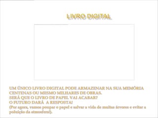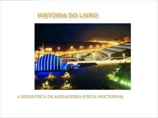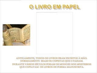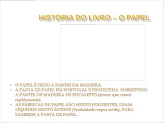 O documento descreve a longa história do livro, desde os primeiros registros em placas de barro até a invenção do papel e livros digitais. Começou com escritos em materiais naturais como madeira e cera, evoluindo para o papiro e pergaminho. O papel foi criado na China e o livro impresso surgiu na Europa no século 15. No futuro, livros impressos e digitais podem coexistir.
