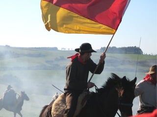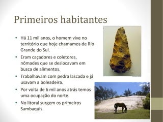 O documento descreve a história do povoamento do Rio Grande do Sul desde os primeiros habitantes há 11 mil anos atrás até a década de 1960. Detalha a chegada dos povos indígenas como os Guaranis, a fundação das missões jesuíticas, a colonização européia e rebeliões como a Revolução Farroupilha e os movimentos pela legalidade na década de 1960.