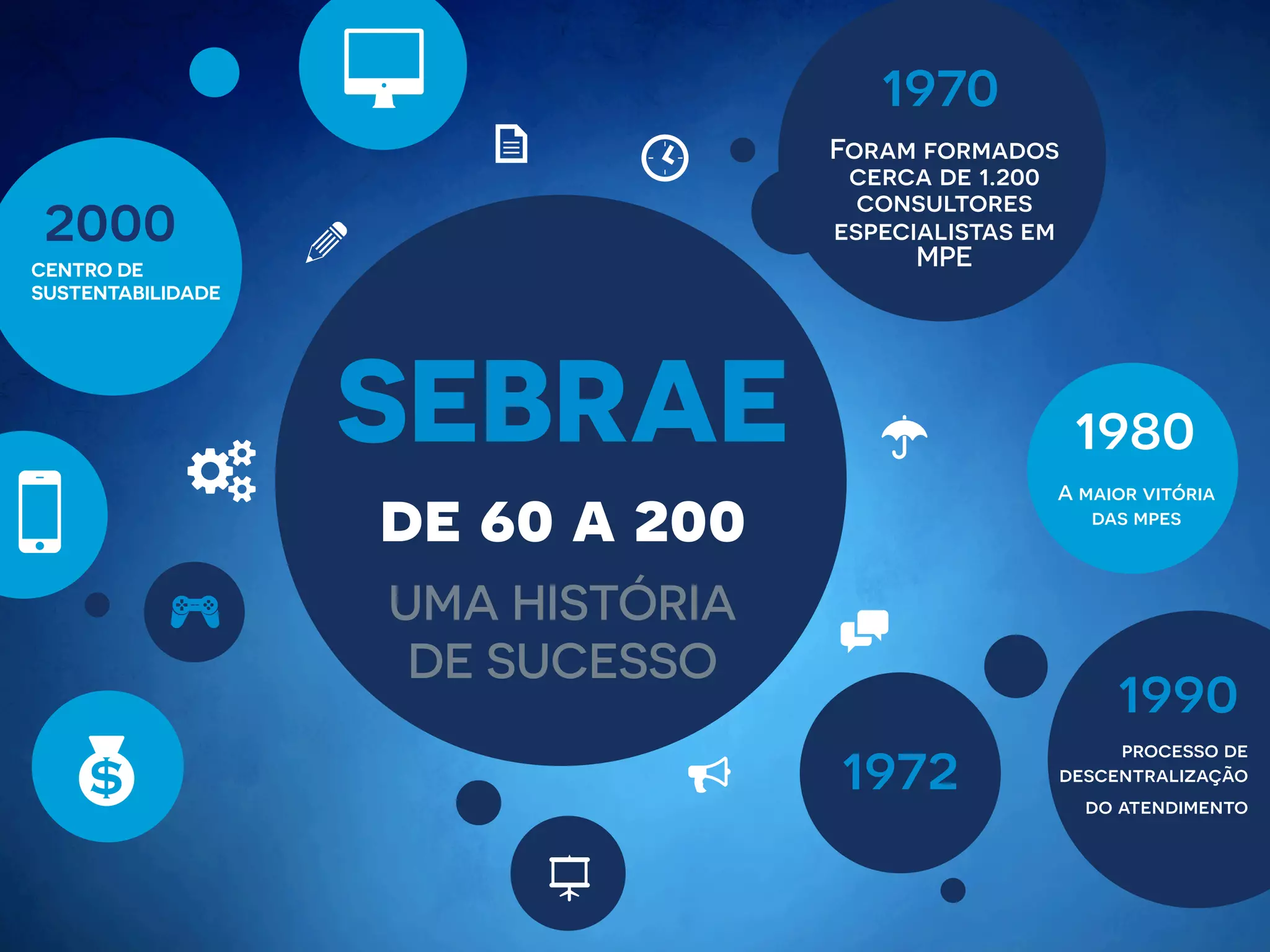 O documento descreve a história de sucesso do SEBRAE ao longo de 60 anos, desde sua criação em 1960 até os dias atuais. Ele destaca os principais marcos, como a formação dos primeiros consultores nos anos 1970, o processo de descentralização nos anos 1980, e o Centro de Sustentabilidade inaugurado em 2000. O texto também aborda os principais programas e projetos implementados em cada década para apoiar micro e pequenas empresas.