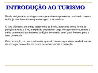 O documento descreve a história do turismo desde a antiguidade até o século XIX. Thomas Cook é apontado como pioneiro na organização de viagens em grupo e na criação da primeira agência de turismo, tornando o turismo acessível às classes média e trabalhadora através de pacotes completos de transporte e hospedagem. O documento também lista e descreve diferentes tipos de turismo.