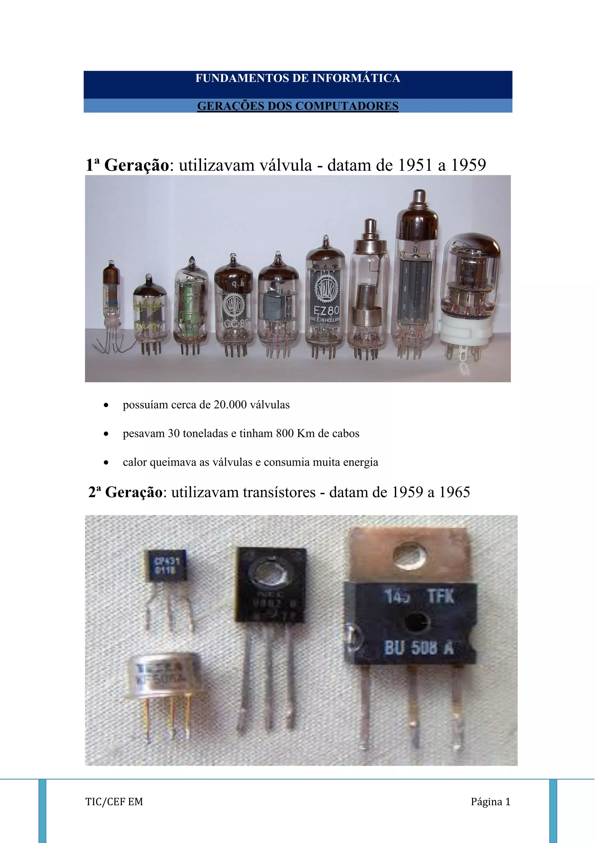 O documento descreve a história e conceitos fundamentais de computadores e tecnologia da informação. Aborda as gerações de computadores desde as de válvula até os atuais de circuitos integrados, partes e componentes de um microcomputador, unidades de memória e armazenamento, conexões e periféricos. Também explica termos e conceitos básicos como hardware, software, processamento de dados e sistemas numéricos.