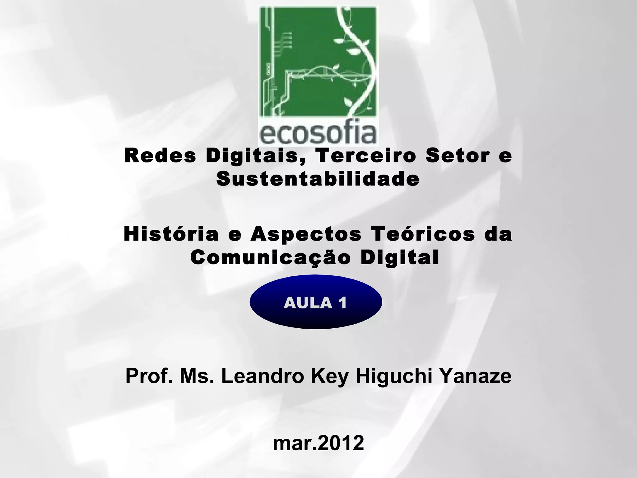 Este documento apresenta uma aula introdutória sobre a história e aspectos teóricos da comunicação digital. O professor apresenta o plano da aula, sua formação acadêmica e experiência, e a agenda do curso. Ele discute brevemente a história da tecnologia e sua relação com a sociedade, as quatro revoluções comunicativas, novos paradigmas trazidos pela comunicação digital e a ética dos hackers.