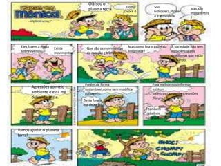 O documento discute a geografia da Terra, explicando que ela é formada pela hidrosfera, litosfera e atmosfera e que esses elementos são importantes para a sobrevivência. Também menciona os movimentos de rotação e translação da Terra e alerta que a sociedade precisa ter mais consciência dos problemas ambientais que está causando, como a agressão ao meio ambiente, mas que o desenvolvimento sustentável pode ajudar a preservar o planeta.