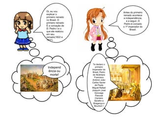 D. Pedro I é coroado o primeiro imperador do Brasil após a independência. Ele enfrenta desafios para organizar o exército e derrotar os portugueses, mas acaba se afastando da elite agrária brasileira ao se aproximar de interesses lusitanos, levando à sua abdicação em 1831.