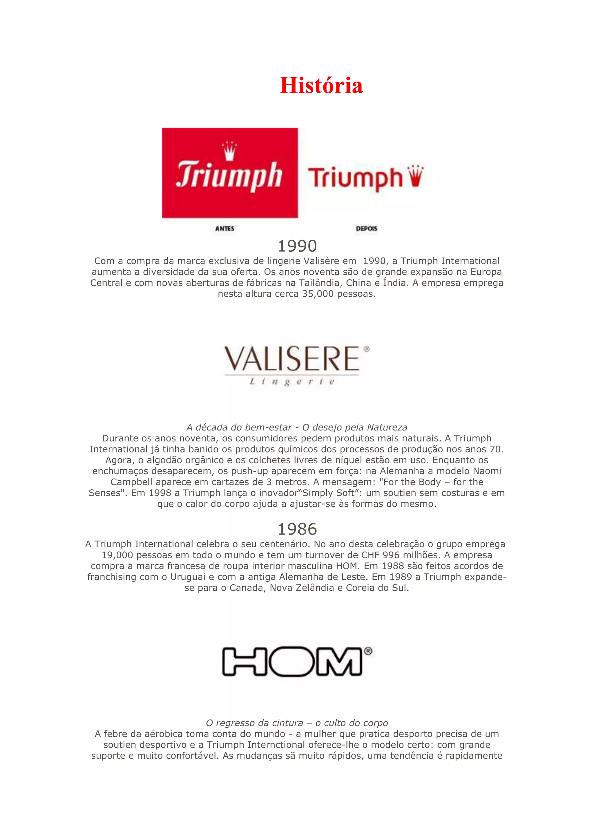 A Triumph International começou como uma empresa de lingerie na Alemanha no século 19. Ao longo do século 20, expandiu-se globalmente e adaptou-se às tendências de moda, lançando novos materiais e estilos de lingerie. Atualmente emprega 43.000 pessoas e comercializa produtos como cuecas, lingeries, biquínis, fatos de banho, soutiens e pijamas em todo o mundo.