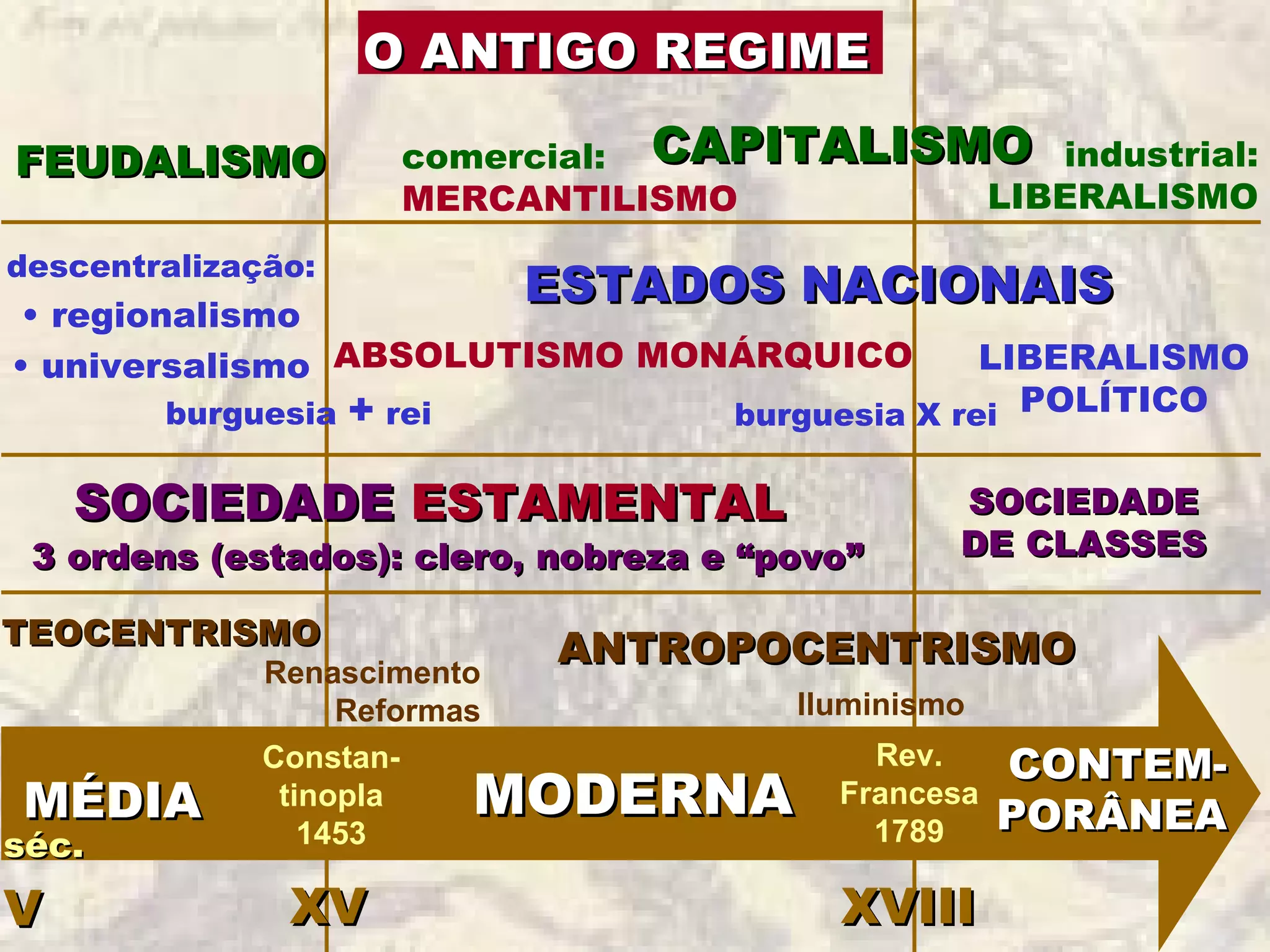 O documento descreve a transição do Antigo Regime para os Estados Nacionais Modernos na Europa entre os séculos XV e XVIII, marcada pela queda de Constantinopla, o Renascimento, as grandes navegações, a formação dos Estados centralizados e o declínio do feudalismo e do absolutismo diante das revoluções burguesas na Inglaterra e França.