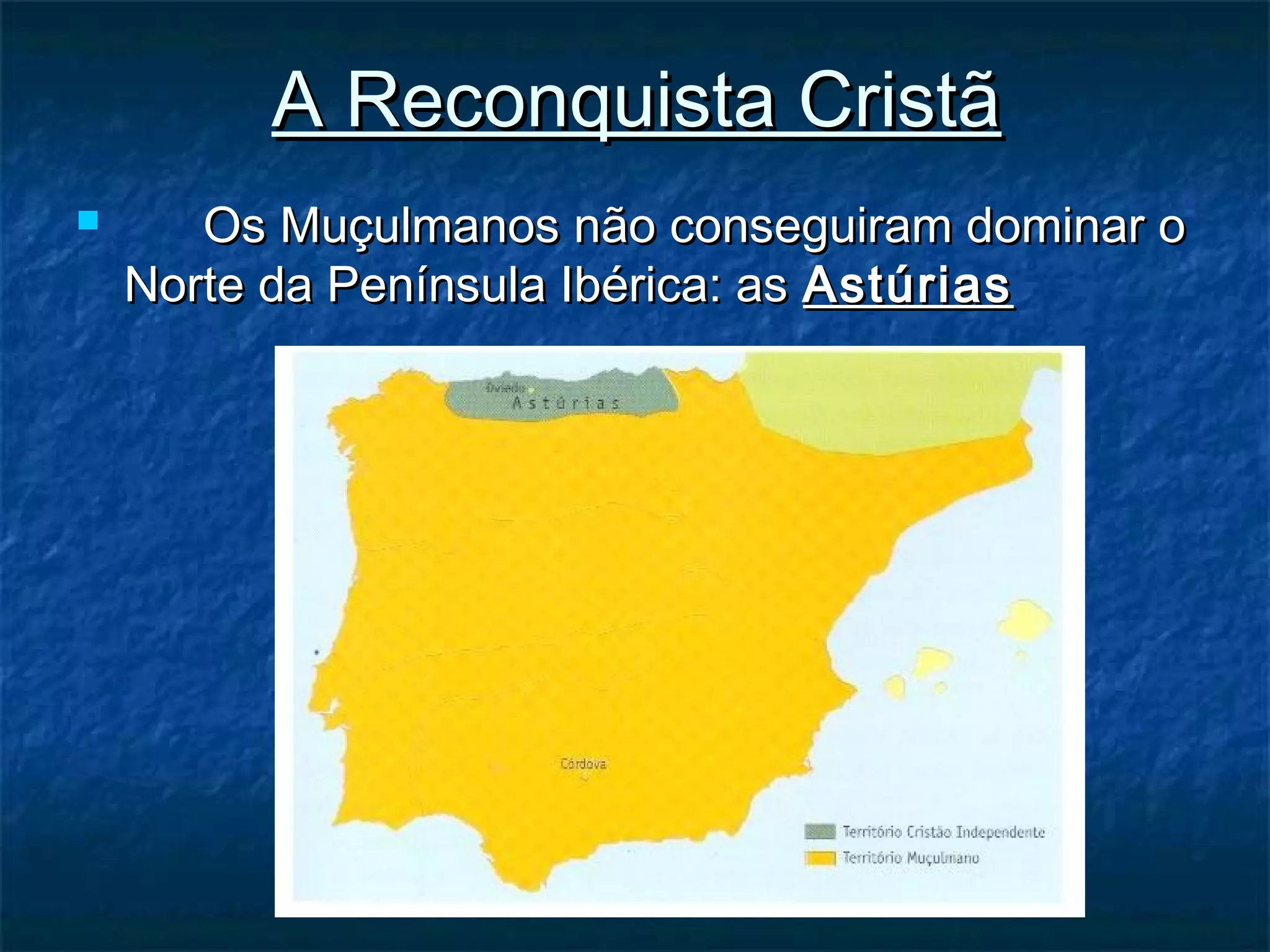 O documento descreve a Reconquista Cristã da Península Ibérica pelos reinos cristãos contra os muçulmanos. Começou com a vitória de Pelágio das Astúrias na batalha de Covadonga, formando-se o primeiro reino cristão. Outros reinos como Leão, Castela, Navarra e Aragão também surgiram durante a reconquista. O Condado Portucalense pertencia a Leão e foi governado por D. Henrique, que recebeu o condado como prêmio por seus serviços ao rei de
