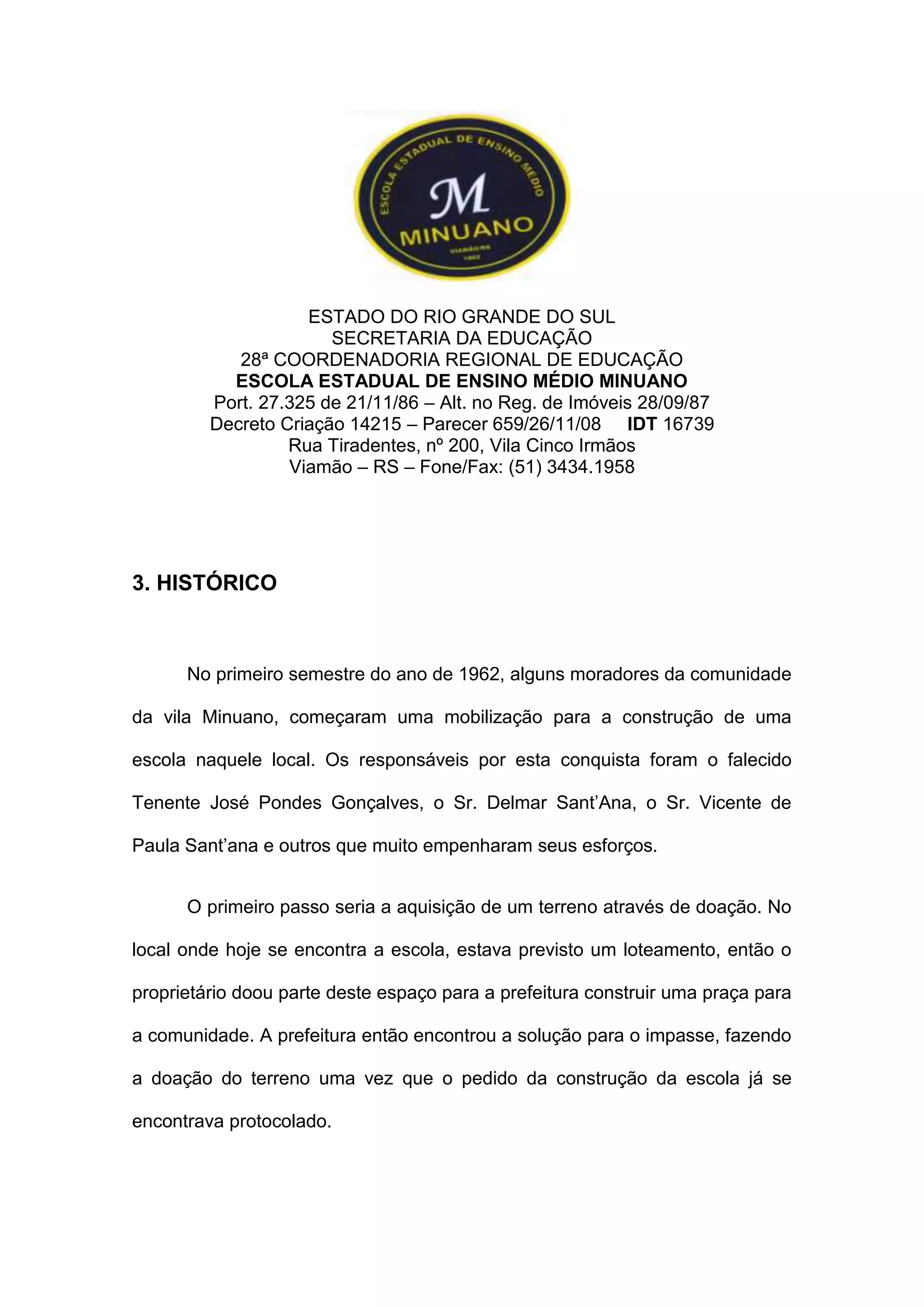 O documento fornece um resumo histórico da Escola Estadual de Ensino Médio Minuano em Viamão-RS desde sua fundação em 1962 até 2009. Ele detalha como a escola foi construída pela comunidade local e gradualmente ampliada ao longo dos anos à medida que o número de alunos crescia. Também lista as principais reformas realizadas na escola e os diretores que a lideraram ao longo do tempo.