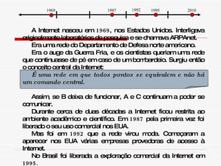 O documento descreve a história da Internet desde sua criação em 1969 como uma rede militar dos EUA chamada ARPAnet até seu uso comercial em 1987 e popularização em 1992. Também explica os principais serviços da Internet como a World Wide Web, chat, transferência de arquivos e e-mail.
