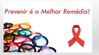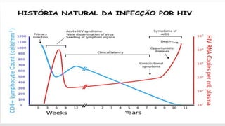 O documento discute o HIV/AIDS, incluindo como o vírus HIV infecta células do sistema imune, levando à síndrome da imunodeficiência adquirida (AIDS) quando não tratado. Também explica os métodos de diagnóstico do HIV, formas de transmissão e prevenção, estágios da infecção, tratamentos disponíveis e referências bibliográficas.