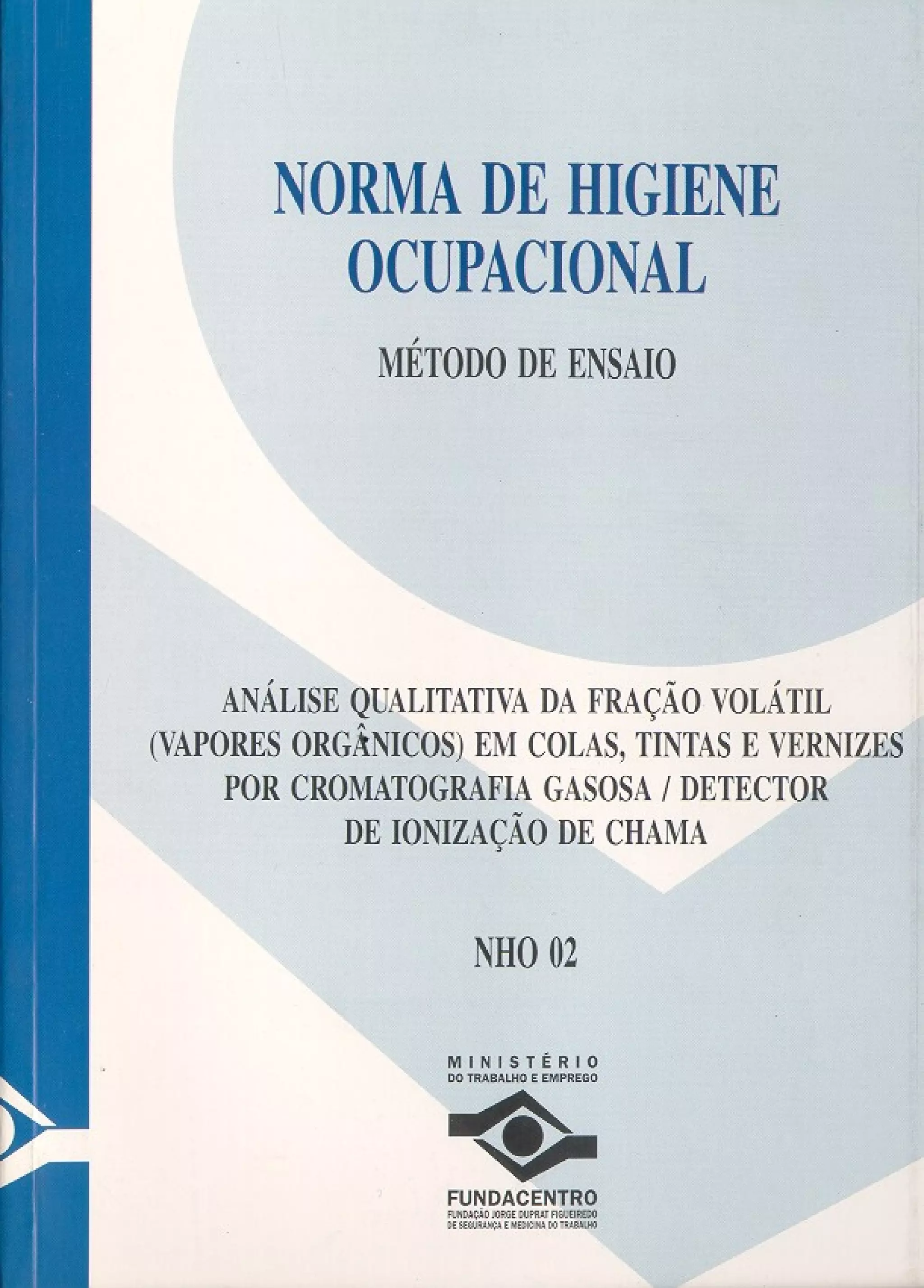 Este documento apresenta um método para análise qualitativa da fração volátil de colas, tintas e vernizes por cromatografia gasosa, visando identificar substâncias voláteis presentes no ambiente de trabalho e prevenir doenças ocupacionais. O método descreve procedimentos para coleta e transporte de amostras, análise cromatográfica e expressão dos resultados.