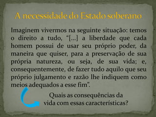 O documento discute as ideias de Thomas Hobbes sobre o estado de natureza e o contrato social. No estado de natureza, vigora a guerra de todos contra todos em razão da disputa humana por recursos. A solução proposta é o contrato social, no qual os indivíduos transferem seu poder para um soberano absoluto em troca de ordem e segurança.