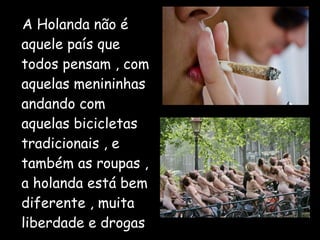 O documento fornece informações gerais sobre a Holanda, seu relevo plano e grande parte de seu território abaixo do nível do mar, necessitando de diques e canais. Apresenta dados sobre sua população, economia altamente industrializada e focada em exportações agrícolas e flores, além de pontos turísticos como museus e curiosidades sobre a Holanda.