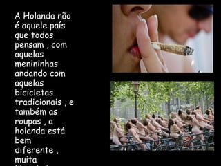 O documento fornece informações gerais sobre a Holanda, seu relevo plano e grande parte abaixo do nível do mar, sua população de mais de 16 milhões e sua economia altamente industrializada e focada no comércio, com destaque para a agricultura, flores e queijos.