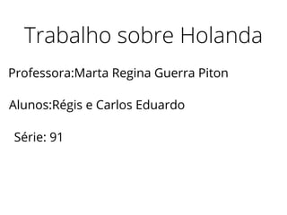 O documento resume aspectos da história, cultura e sociedade da Holanda. Ele descreve que a Holanda começou como vários condados que foram unificados por volta de 1600, tornando-se um país. Também menciona que a população atual é de aproximadamente 17,5 milhões de pessoas, que falam principalmente holandês, e que a capital é Amsterdã. Resume alguns costumes holandeses como tirar os sapatos em casa, cumprimentar com três beijos e usar bicicleta como principal meio de transporte.