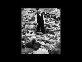 O documento aborda o horror do Holocausto, destacando a brutalidade do regime nazista que resultou na exterminação de cerca de 10 milhões de pessoas, incluindo 6 milhões de judeus, entre 1942 e 1945. Ele descreve os métodos de execução, como câmaras de gás e trabalho forçado em campos de concentração, e a desumanização sistemática dos prisioneiros. Embora alguns neguem a realidade do Holocausto, o texto enfatiza a dor e a morte causadas pelo genocídio, enquanto ressalta que a responsabilidade não recai sobre todo o povo alemão, muitos dos quais desconheciam os acontecimentos.