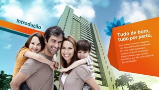 O documento apresenta informações sobre a localização e características de apartamentos no Parque Amazônia, destacando a conveniência da região próxima a comércios e serviços. Oferece plantas de apartamentos de 2 e 3 quartos com diferentes perfis, além de áreas comuns como piscina e salão de festas. São cinco opções de planta disponíveis para atender às necessidades das famílias.