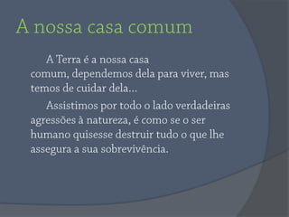 O documento discute a degradação ambiental e lista os nomes de cinco estudantes e seus números - Carlos no 7, João no 15, Miguel no 19, Raquel no 22 e Ricardo no 25 - que podem ter trabalhado em um projeto relacionado ao meio ambiente.