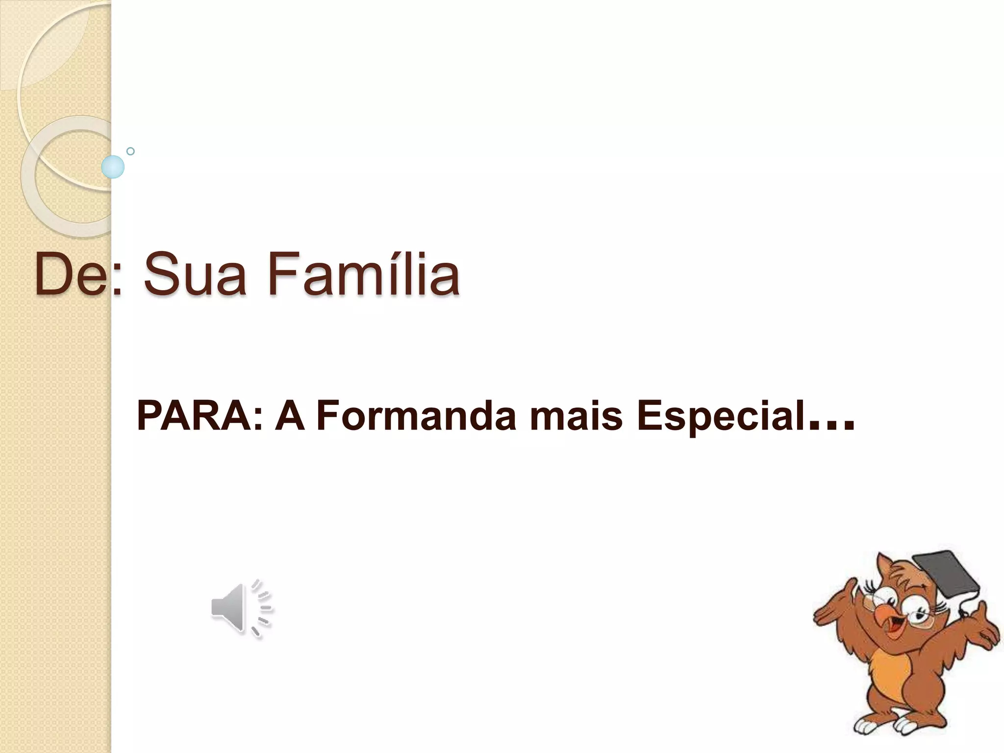 Este documento é uma mensagem emocional da família para a formanda, expressando admiração por sua luta, coragem e amor. Eles refletem sobre os aprendizados e momentos compartilhados juntos, ressaltando a importância da família e do amor. A mensagem termina parabenizando a formanda pela sua conquista e reafirmando seu amor e orgulho.
