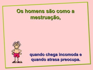 O documento faz várias comparações entre homens e objetos do cotidiano, descrevendo homens de forma negativa e estereotipada. As comparações incluem homens como mestruação, férias, bananas, vassouras, tempo, pão de forma, café, carros usados, computadores, publicidade, banheiros públicos, Toddy, nevasca, fotocopiadoras, cerveja, estacionamento, macarrão, dirigir carro e caixa de isopor.