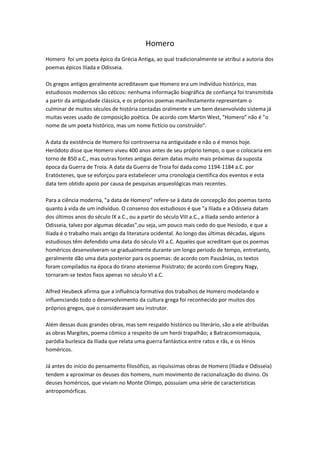Homero foi um poeta épico grego antigo ao qual se atribui a autoria dos poemas Ilíada e Odisseia, embora sua existência como indivíduo histórico seja questionada. Os poemas datam provavelmente do século IX ou VIII a.C. e influenciaram profundamente a cultura grega, sendo considerados por muitos como os primeiros trabalhos da literatura ocidental.
