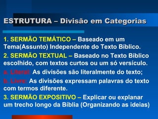 Este documento fornece informações sobre a estrutura e tipos de sermões, incluindo temático, textual e expositivo. Descreve as características, vantagens e desvantagens de cada tipo de sermão, além de fornecer exemplos de esboços para cada um.