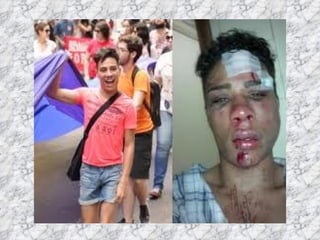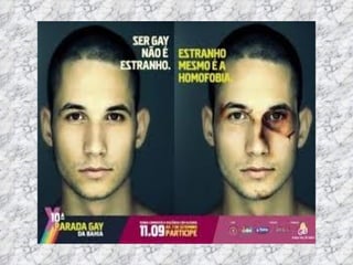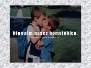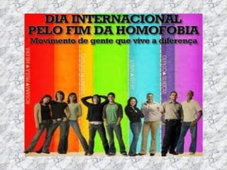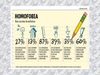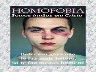 O documento discute o tema da homofobia. Ele fornece definições de termos como homofobia, bifobia e transfobia. Também descreve declarações da ONU sobre a necessidade de combater a discriminação. Por fim, resume leis e debates sobre direitos LGBT no Brasil.