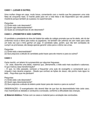Este documento fornece uma aula sobre honestidade para crianças com o objetivo de ensinar que a honestidade é uma virtude importante. A aula inclui uma atividade inicial, uma explicação do que é a honestidade e desonestidade, e o estudo de três casos para discutir exemplos de atos honestos e desonestos.