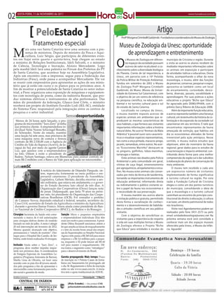 A noite de ontem marcou o início da maior competição esportiva de Santa Catarina. Hoje os atletas começam a busca por medalhas na competição. A prefeitura de Forquilhinha entrega hoje a segunda etapa da pavimentação da Avenida Professor Eurico Back no valor de R$ 3,5 milhões. O Museu de Zoologia da Unesc oferece oportunidades de aprendizagem e entretenimento para os visitantes através de sua coleção e atividades educativas.