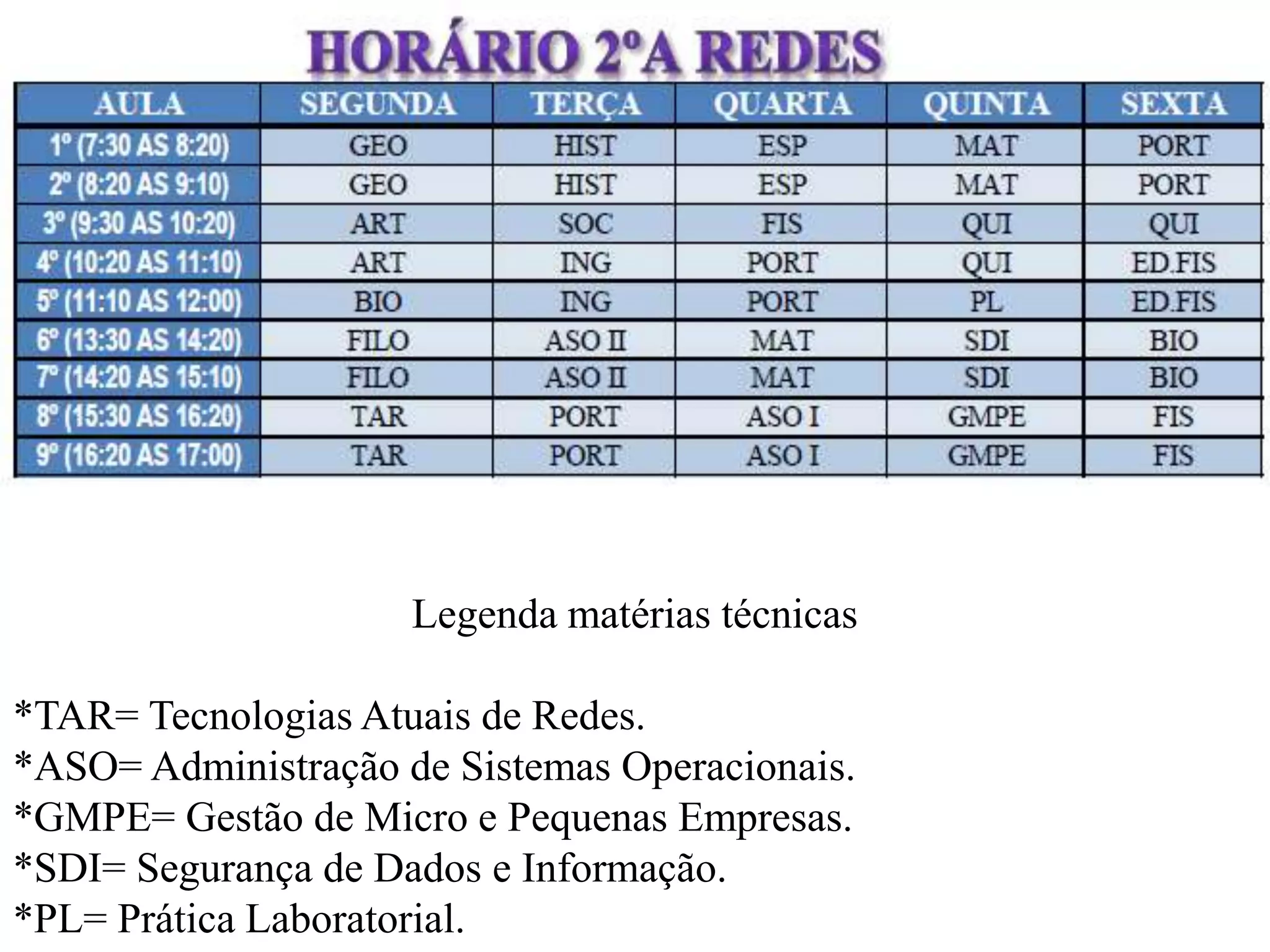 Esta lista fornece as siglas para cinco matérias técnicas: TAR para Tecnologias Atuais de Redes, ASO para Administração de Sistemas Operacionais, GMPE para Gestão de Micro e Pequenas Empresas, SDI para Segurança de Dados e Informação, e PL para Prática Laboratorial.