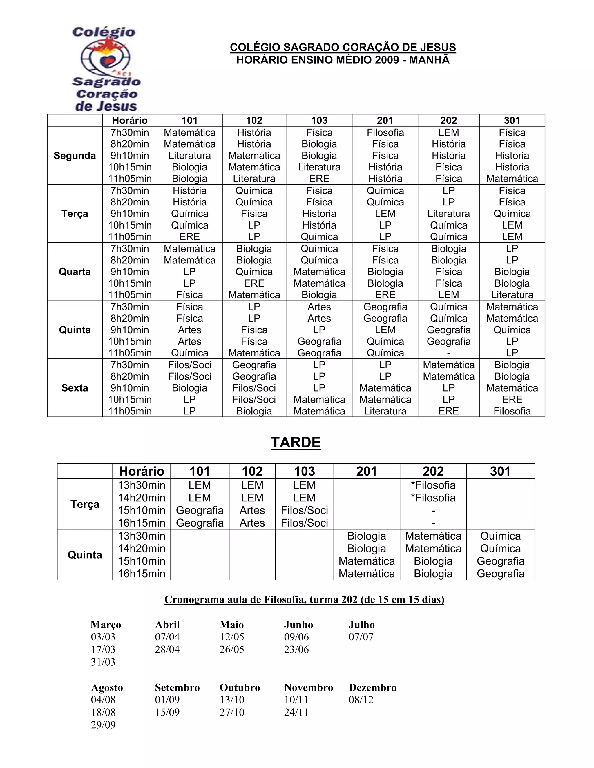 O documento apresenta o horário de aulas do ensino médio de um colégio para o ano de 2009, dividido entre manhã e tarde. Na parte da manhã, as aulas são distribuídas entre diferentes disciplinas como Matemática, História, Física, Química e outras para cada turma nos dias da semana. À tarde, as aulas são para LEM, Geografia, Artes e Filosofia.