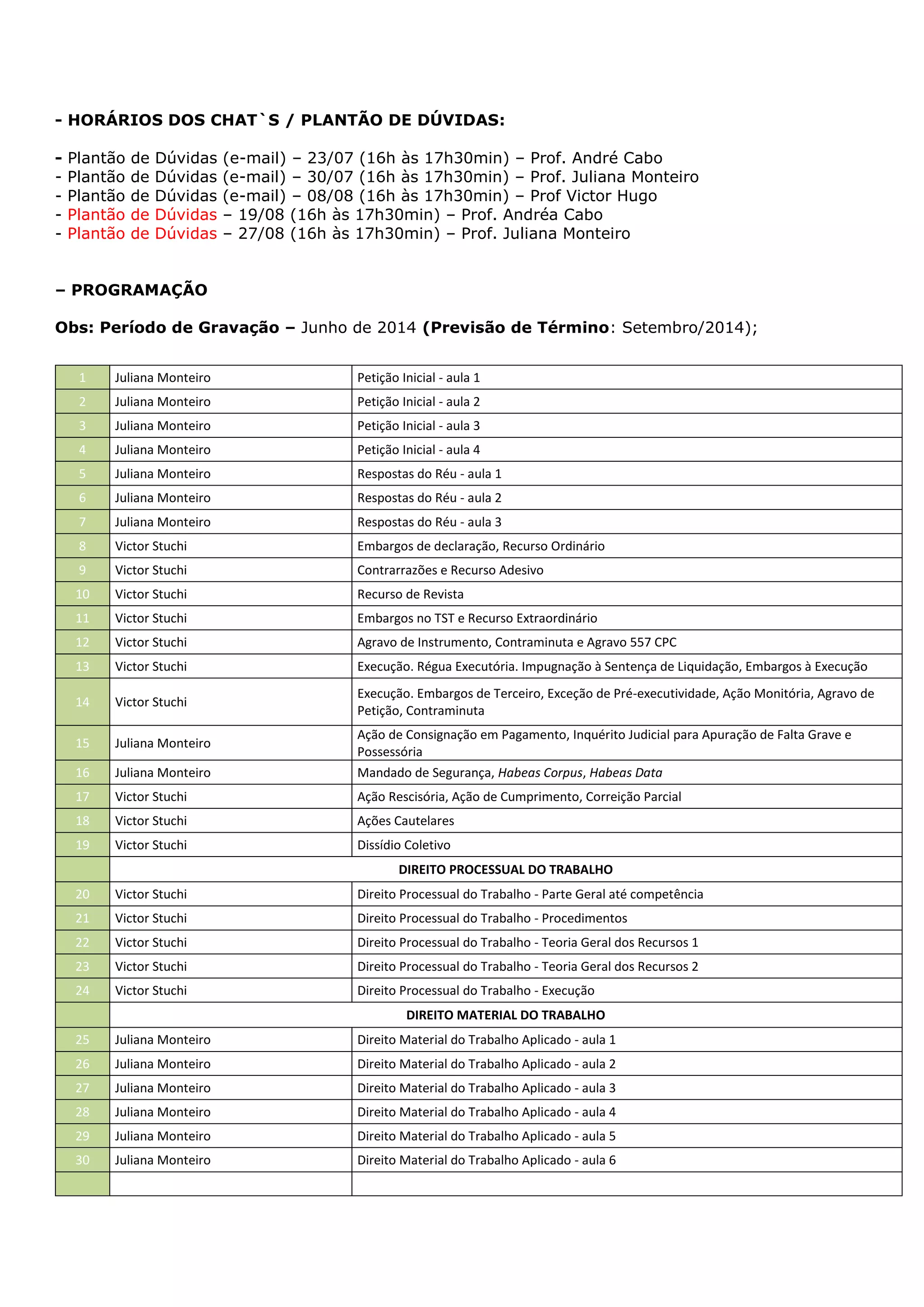 O documento lista os horários de plantões de dúvidas por e-mail de professores e a programação de aulas sobre Direito Processual e Material do Trabalho, com nomes de professores e temas a serem abordados em cada aula.