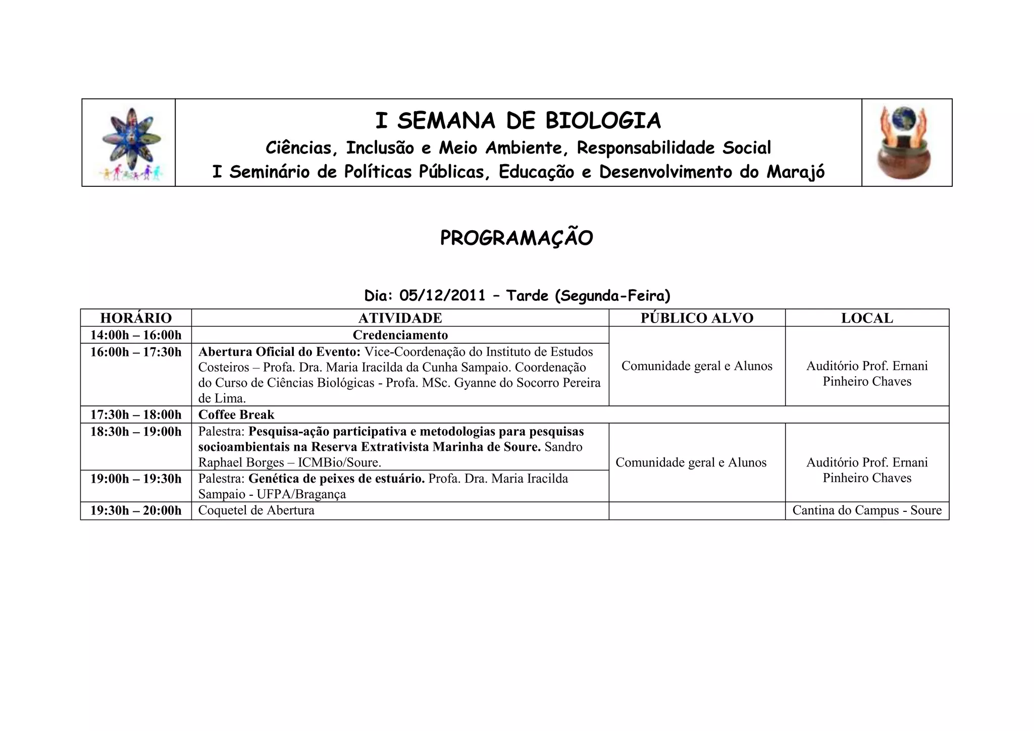 Este documento apresenta a programação de uma semana de biologia realizada em Soure, Pará, entre os dias 5 e 8 de dezembro de 2011. A programação inclui palestras, mesas redondas, exposições de trabalhos acadêmicos, minicursos e oficinas sobre diversos temas relacionados à biologia, meio ambiente e inclusão social.