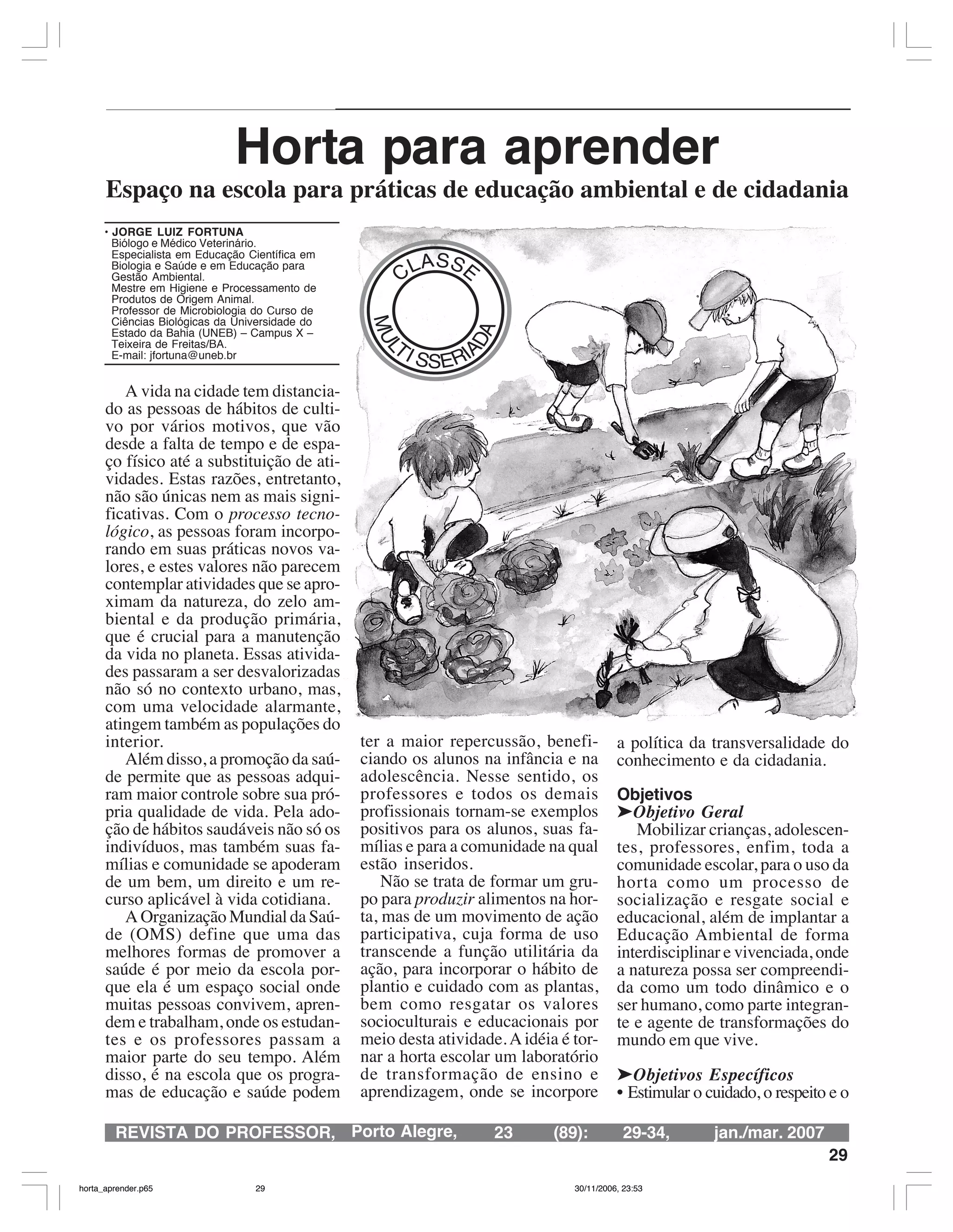 (1) O documento descreve o planejamento e implementação de uma horta escolar como projeto de educação ambiental e promoção da saúde. (2) Ele fornece detalhes sobre a escolha do local, preparação dos canteiros, cultivo e cuidados com as plantações, além de objetivos educacionais do projeto. (3) A horta é proposta como um laboratório vivo para ensinar conceitos interdisciplinares de forma prática.