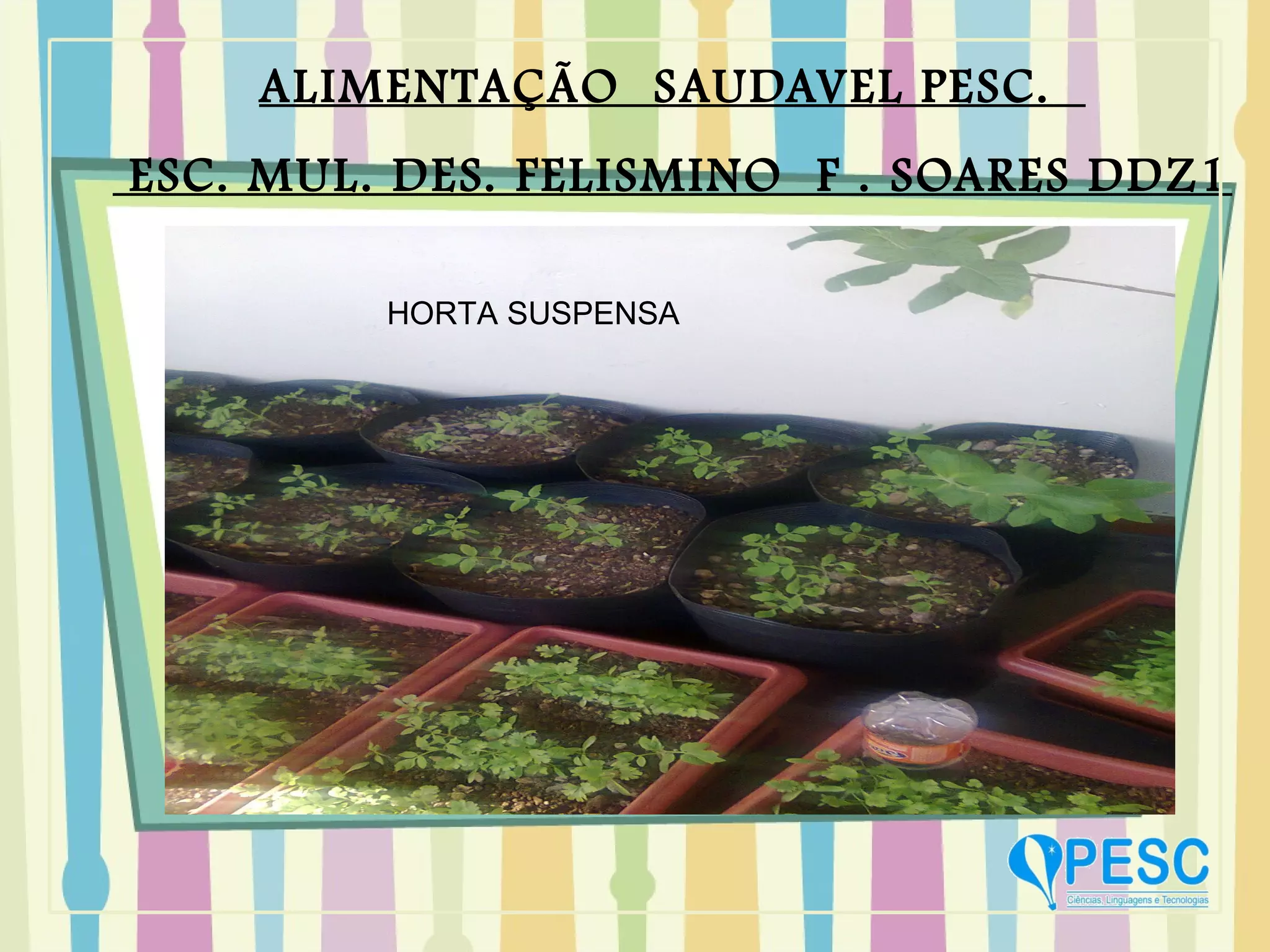 O documento descreve um projeto de horta suspensa em vasos no terraço de três andares da Escola Municipal Desembargador Felísmino Soares para cultivar hortaliças de forma saudável. O projeto demonstra que com compromisso em educação e vontade, projetos podem ser realizados mesmo com barreiras estruturais.