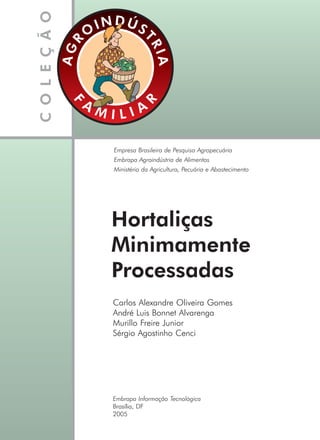 Este documento descreve as principais etapas do processo de produção de hortaliças minimamente processadas: 1) recepção, seleção e tratamento final das matérias-primas; 2) pré-lavagem, corte, sanitização e enxágüe; 3) centrifugação, pesagem, selagem e etiquetagem; 4) armazenagem sob refrigeração e distribuição do produto final. O objetivo é fornecer informações sobre boas práticas de fabricação para agregar valor à pequena produção de hortaliças.
