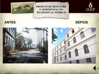 O documento apresenta o projeto de restauro e modernização do Hospital Pedro II. As imagens mostram como era o hospital antes e como ficou depois da reforma, com novas estruturas e equipamentos. O texto final contém uma mensagem do Instituto de Medicina Integral Professor Fernando Figueira sobre a importância da medicina na luta contra as desigualdades sociais.