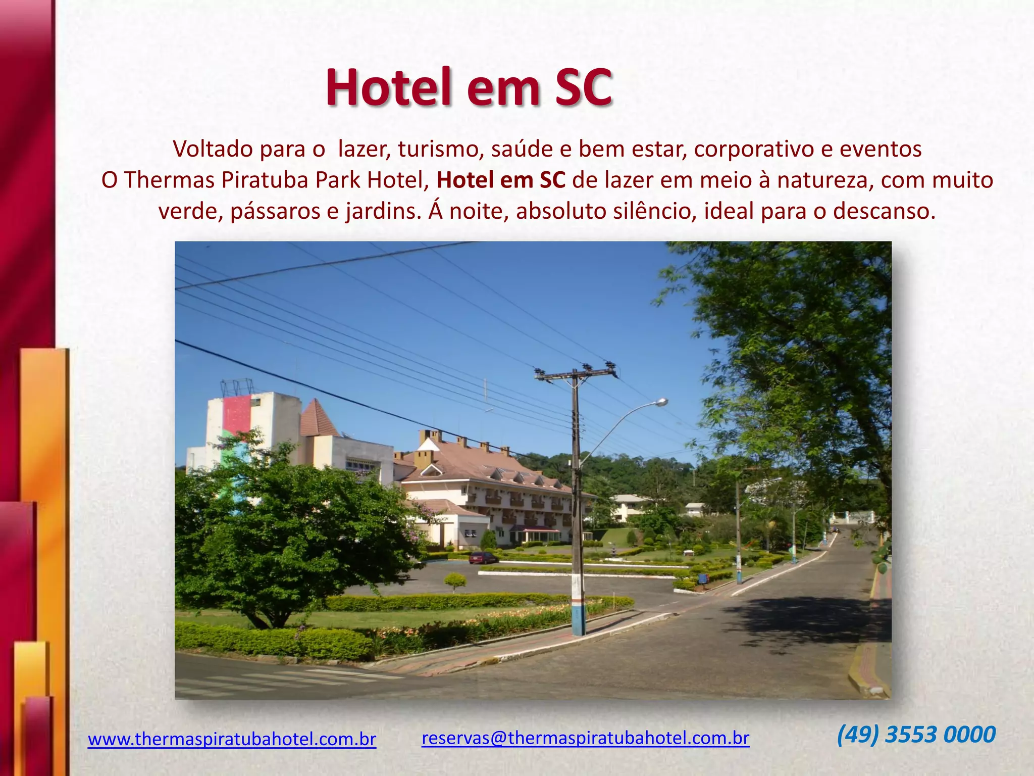 O Thermas Piratuba Park Hotel é um hotel em Piratuba, Santa Catarina, localizado em meio à natureza, com muitas opções de lazer e entretenimento, como piscinas, saunas, jogos e trilhas. O hotel oferece apartamentos com vista para a natureza e refeições incluídas, além de espaço para eventos.